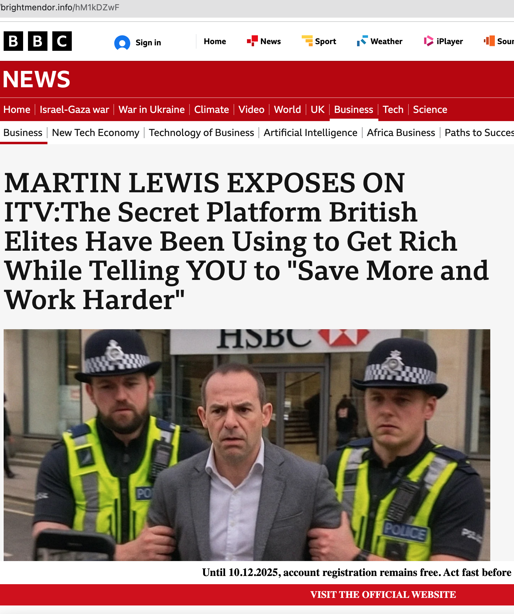 - The Headline: "MARTIN LEWIS EXPOSES ON ITV..." is a classic sensationalist hook. They use capital letters and emotional triggers ("Secret Platform," "British Elites," "Get Rich") to bypass your critical thinking.